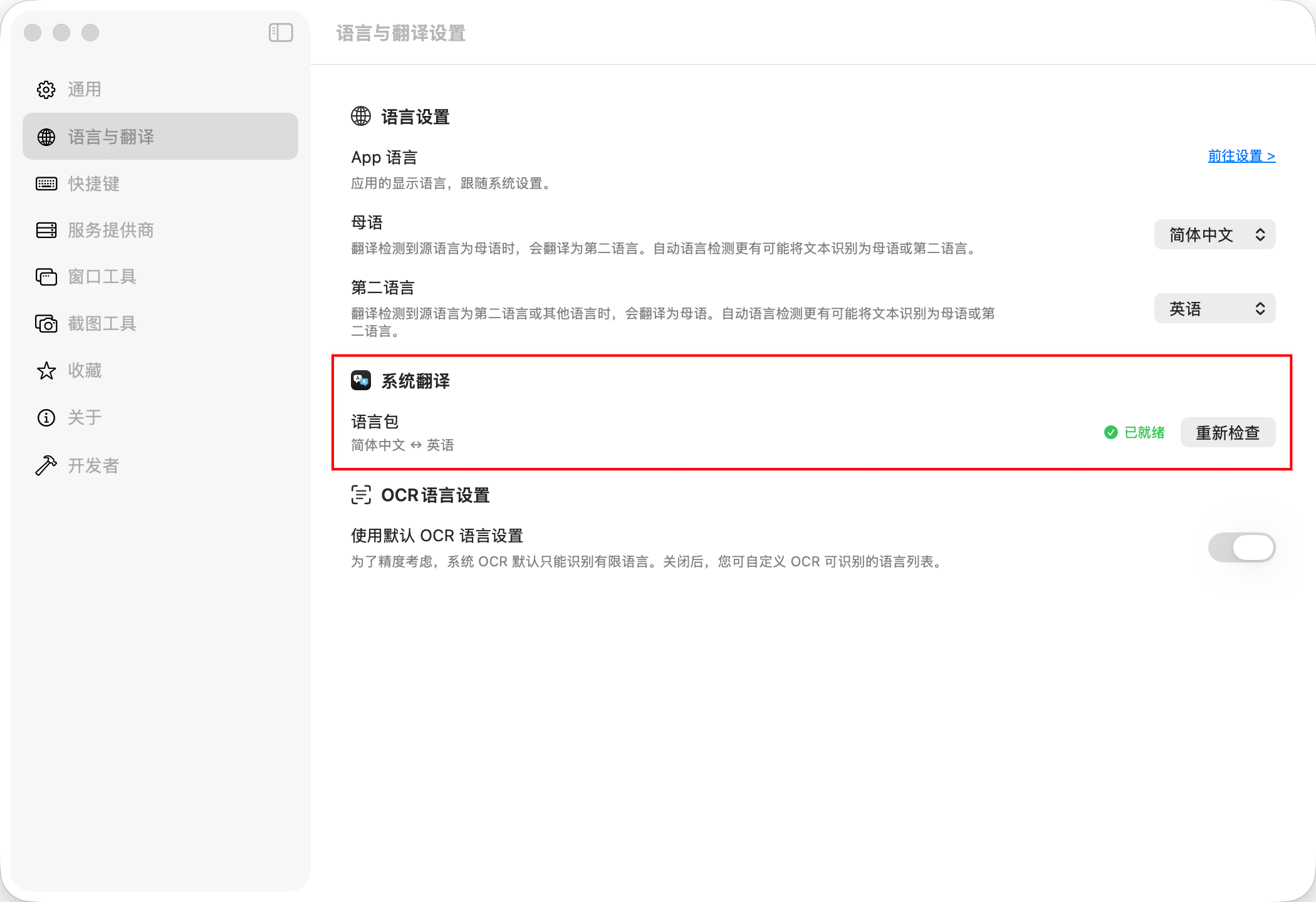 Jelly 的划词气泡窗中使用了 MacOS 系统翻译,以此来提供高速、离线的翻译体验。系统翻译功能依赖您先下载语言包。